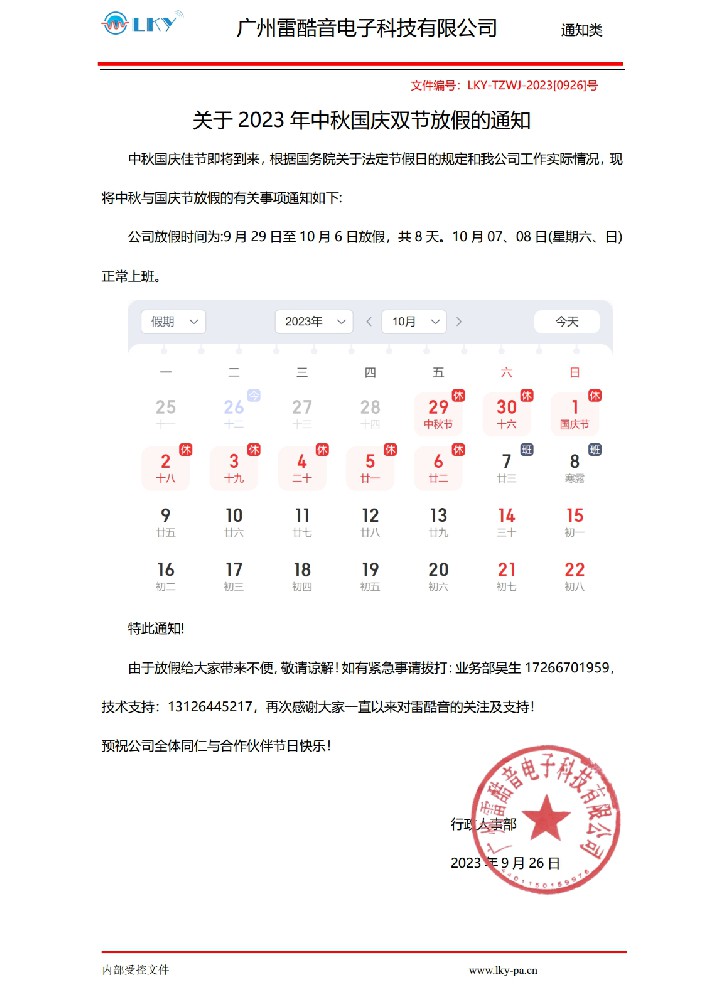 LKY-2023年中秋國慶放假通知